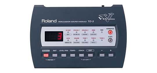 Hervorragende Drum Sounds Das TD-3 Percussion Soundmodul bietet 114 hervorragende Drum und Percussion-Sounds in 32 Kits mit optimaler Ausdruckskraft - einschließlich separaten Fell/Rand-Triggerings auf der Snare und Spielfläche/Rand-Triggerings auf der Hi-Hat. Da es wirklich einfach zu bedienen ist, können Sie sofort anfangen zu spielen. Um ein Drum Kit anzuhören, verwenden Sie einfach die Phrase Preview-Funktion und ein kurzes Demo stellt das gewählte Kit vor. Zur Soundverfeinerung verfügt das TD-3 über 15 Ambient-Effekt-Typen und Kompression.