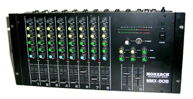 Monarch 19`` Rackmixer MMX-808 Sehr gut geeignet als Keybordmixer 8- Kanal Rackmixer Pro Kanal: Gain - Höhen - Tiefen - Monitor Effect und Panorama. 4,5cm Lautstärkefader Ein- und Ausgänge : Klinge